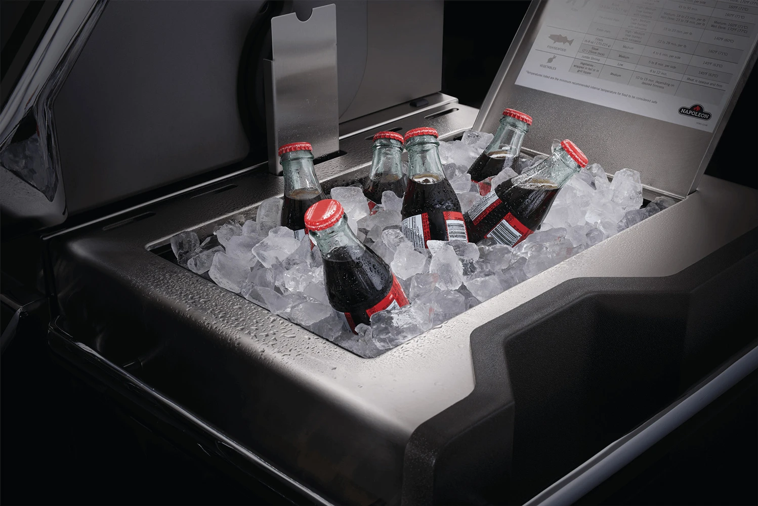 Einige versteckte Extras fallen erst auf den zweiten Blick auf. Während in der linken Seitenablage die Sizzle Zone verbaut ist, findet sich unter der Abdeckung in der rechten Seitenablage ein wirklich geniales Eisfach. Trotz der Nähe zu den Brennern erwärmt sich das Eisfach nicht. So können Sie es mit Crushed Ice füllen und zum Beispiel Getränke kühl lagern. Natürlich auch eine hervorragende Möglichkeit das Grillfleisch abgedeckt und kühl bis zum Garen zu lagern.