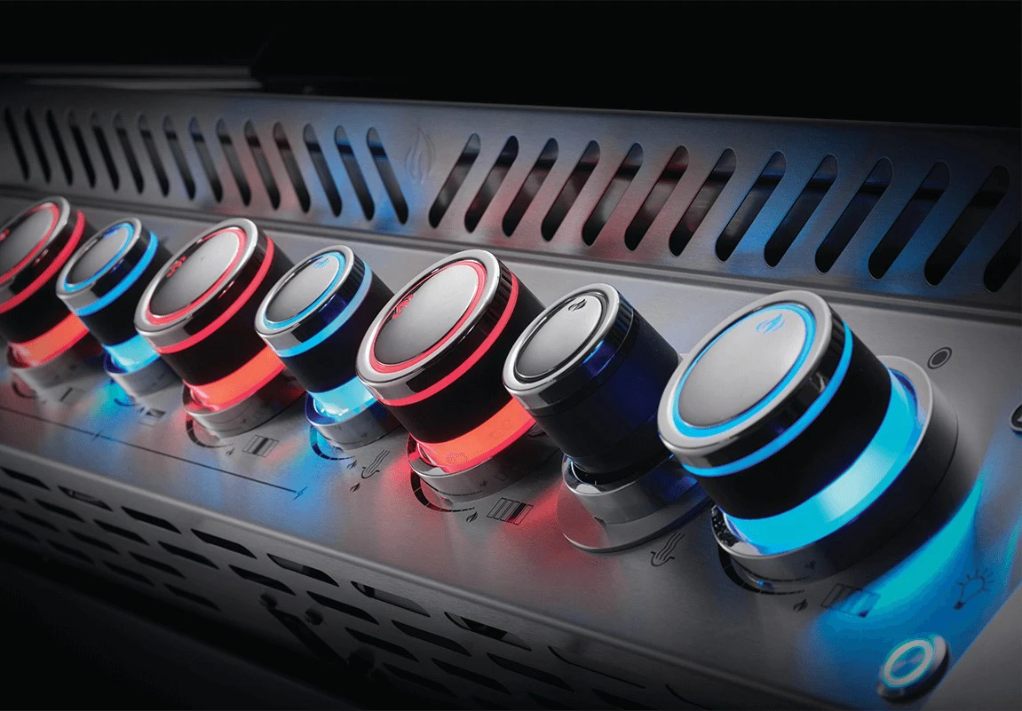 Perfekt in Szene gesetzt und noch dazu stets die Kontrolle über den Garraum – mit den speziellen SAFTY GLOW™ Drehreglern erkennen Sie auf einen Blick, ob der jeweilige Brenner gerade in Betrieb ist oder eben nicht. Die Regler leuchten in den Farben Blau und Rot. Blau bedeutet der Brenner ist aus (bzw. kein Gasfluss vorhanden), Rot bedeutet Gas fließt und der Brenner ist in Betrieb.