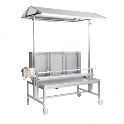 Das dazugehörige Dach schützt vor Regen, kann aber auch abgenommen werden. Um den massiven Spanferkelgrill komfortabel bewegen zu können, ist er mit großen Gastronomierädern ausgestattet, von denen sich zwei zur Sicherheit feststellen lassen. So kann der Grill bei Bedarf an jeden beliebigen Ort transportiert werden.