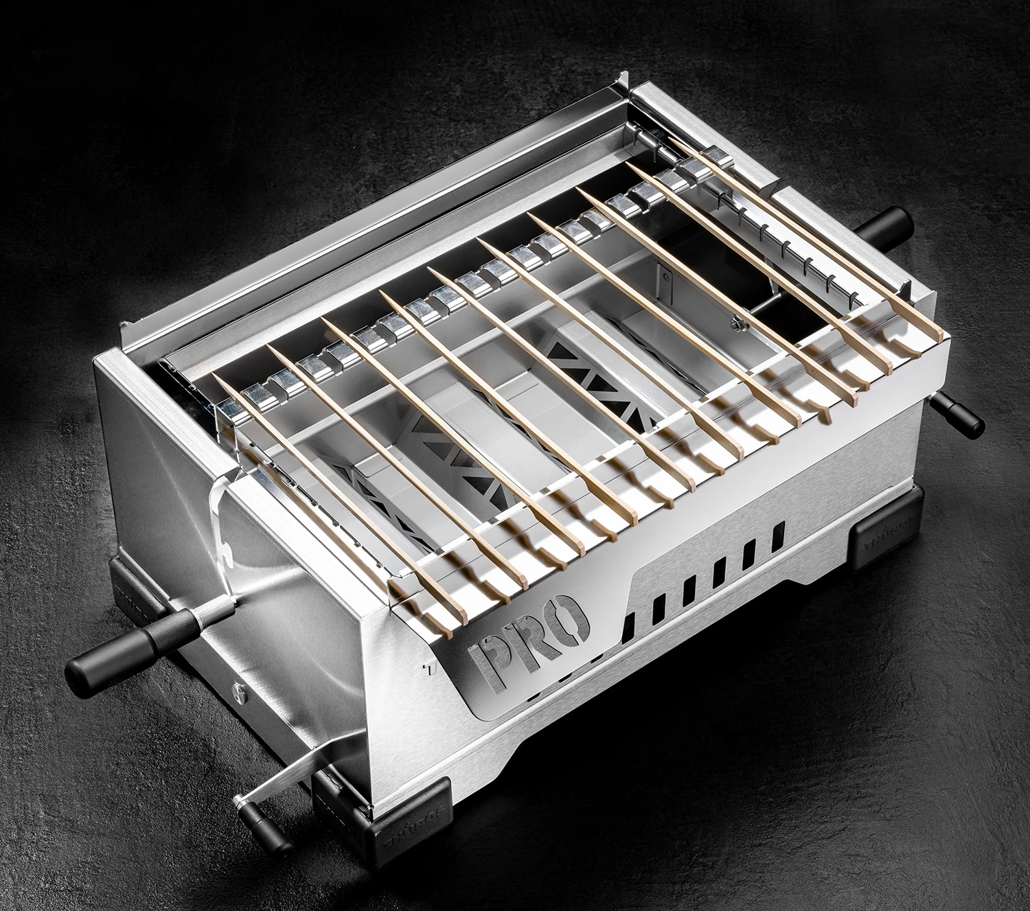 Durch die verstellbare Auflageleiste lassen sich Spieße in verschiedenen Längen grillen. So können zum Beispiel auch kurze Spieße beidseitig aufgelegt und direkt am Tisch zubereitet werden. Dabei bietet der Überstand nach vorne bei Drehen der Spieße Schutz vor der Hitze.