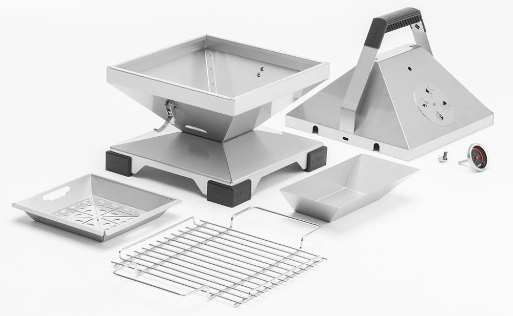 Dank eines umfangreichen Zubehörsortiments lässt sich der kompakte Holzkohle Tischgrill ganz nach den eigenen Bedürfnissen modular erweitern. Neben der im Lieferumfang enthaltenen BBQ-Haube stehen zum Beispiel ein Windschutzblech zur Höhenverstellung des Grillrostes und ein passender Drehspieß als Erweiterungsmodule bereit.
